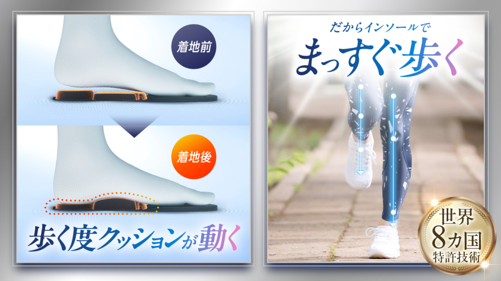 技術: 世界8カ国特許「エアークッション技術」を採用。歩くたびに空気が動き、悩みの原因となる衝撃を和らげます。
